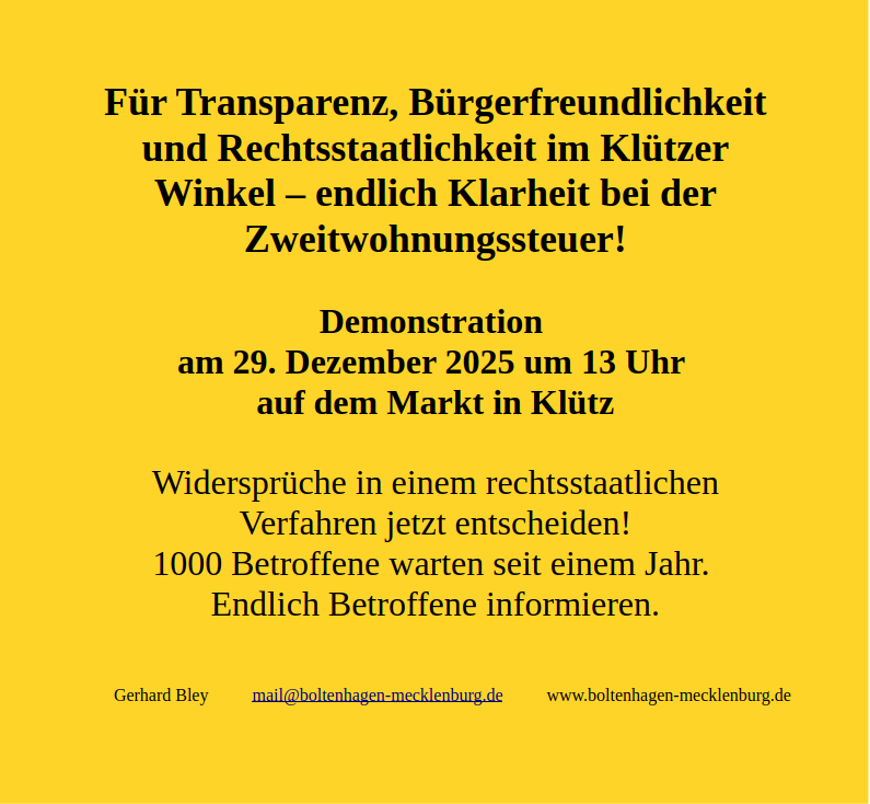 lesenswert: Antworten der Amtsverwaltung Klützer Winkel auf den Prüfauftrag aus der Sitzung des Amtsausschusses des Amtes Klützer Winkel vom 31. März 2025 - Hier wird zu vielen Fragen die Widerspruchsverfahren betreffend eingegangen. Dieses Schreiben des Amtes ist gleichlautend in allen Gemeindevertretungen des Amtes Klützer Winkel im Rahmen der Beratungen zum Abschluss eines öffentlich-rechtlichen Vertrages zur Bearbeitung der Zweitwohnungssteuer im Juni 2025 behandelt worden.